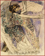 Евгения Илюхина: Причем миф, к которому приложили руку сами художники, вольно или невольно. Врубель своим в какой-то степени экстравагантным поведением, манерой одеваться, своими какими-то неожиданными решениями. Он порой поддерживал этот миф настолько, что иногда сливался с образом демона. И даже в посмертной речи Блок говорил о том, что он "демон - дух мятежный", который пришел в наш мир. А с другой стороны, о Борисове-Мусатове его первый биограф Станюкович, сокрушаясь, говорил, что он создал этот миф об этом художнике. Миф о таком отшельнике, тоже с трагической судьбой. Лиля Пальвелева: При этом один из мифов - о том, что колдовские, завораживающие образы у Врубеля возникали благодаря его психической болезни, что творил он в экстатическом состоянии - на выставке развенчивается. В последнем зале можно увидеть рисунки Врубеля, сделанные им в период обострения недуга, в клинике. Это несколько портретов и иллюстрация к "Царю Салтану". Трудно представить себе более грустное зрелище. Ничто не напоминает руки знаменитого художника, так беспомощны эти работы, будто неумелому ребенку дали в руки цветные карандаши. И тут же - быть может, самые изощренные вещи Врубеля - его перламутровые раковины. Особенно хороша не та знаменитая пастель с русалками под названием "Жемчужина" (она часто репродуцируется), а другая, менее известная. Посмотришь издали - драгоценным светом переливается перламутр. Подойдешь ближе - рисунок то сделан одним лишь черным углем по белой бумаге! Евгения Илюхина: Чарует в графике вот это невероятное рождение формы на наших глазах. Лиля Пальвелева: Подчеркивает Евгения Илюхина. Работ Борисова-Мусатова на выставке ощутимо меньше. Евгения Илюхина: Это обусловлено еще собранием Третьяковской галереи, где работ Врубеля просто больше, чем работ Борисова-Мусатова. Поэтому попытка поделить абсолютно пополам эту анфиладу просто нереальна. Лиля Пальвелева: Однако диспропорции почти не замечаешь. Вещи Борисова-Мусатова - первого ряда. Более того, представлены отдельные циклы. Евгения Илюхина: Последний зал - это цикл осенних пейзажей Борисова-Мусатова, который представляет собой своеобразную сюиту с развитием вот этого мотива осенних берегов Оки, которые были увидены с балкона. То приближал он, то отдалял, создавая такие произведения. Лиля Пальвелева: Один лишь куст орешника художник рисует трижды, и даже в солнечный день золотистая листва подернута легкой дымкой. Вещи Борисова-Мусатова легко узнаваемы. Это всегда немного мираж, туманная греза. Более того, своих героев мастер обычно помещает в былые эпохи. И костюмы, и антураж - давние. "Серебряный век", немного пугаясь этого, любил ловить свое меланхоличное отражение в прошлом. Анна Ахматова: Красотка очень молода, Лиля Пальвелева: Стихотворение "В зазеркалье" Ахматовой - позднее, 60-х годов, но бесспорно Борисову-Мусатову созвучное. Мотив двойника, отраженного (и искаженного!) в зеркале, с начал 20 века был широко распространен в русском искусстве.